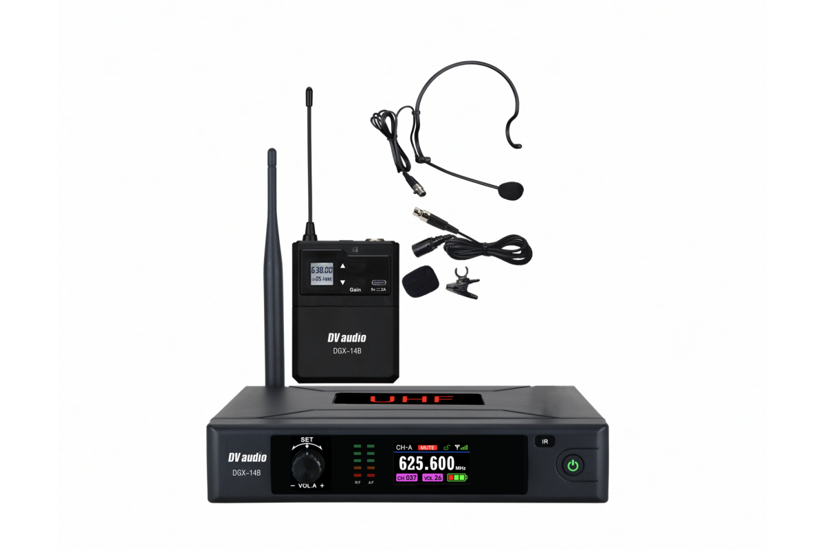 Радіосистема DV audio DGX-14B - бюджетна високочастотна UHF радіосистема з поясним передавачем гарнітурою чорного кольору, та петличним мікрофоном чорного кольорі у комплекті. Проста у використанні, але забезпечує чудове звучання без вічно плутаються або недостатньо довгих проводів.