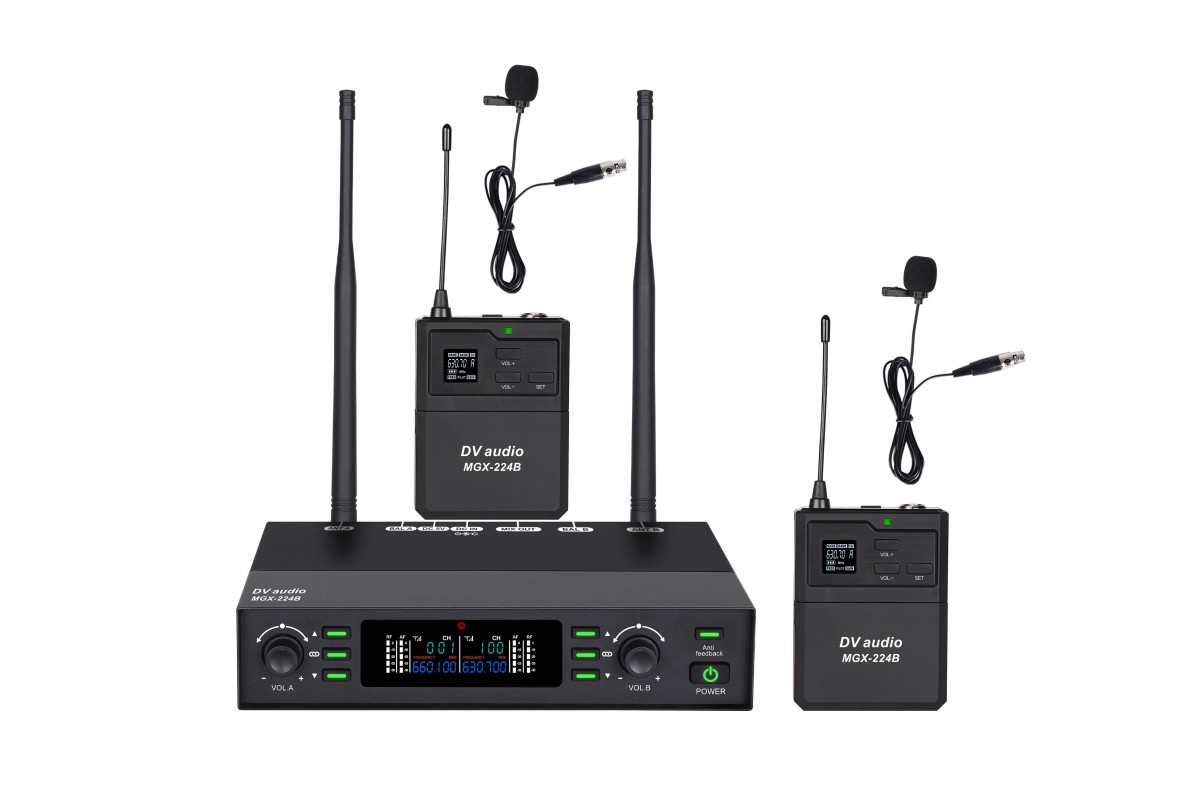 DV audio MGX-224B - це надійна двоканальна UHF-радіосистема, розроблена для використання в караоке-закладах, конференц-залах, на невеликих сценах тощо.