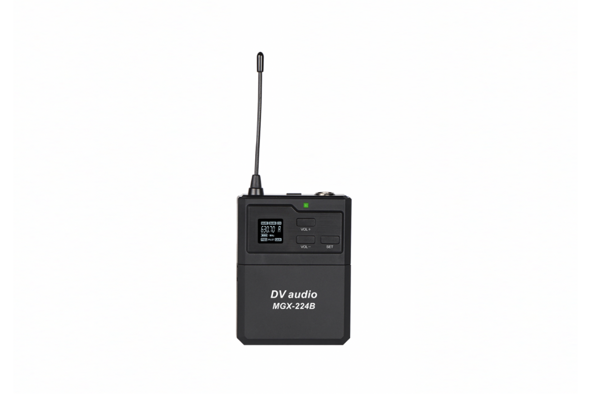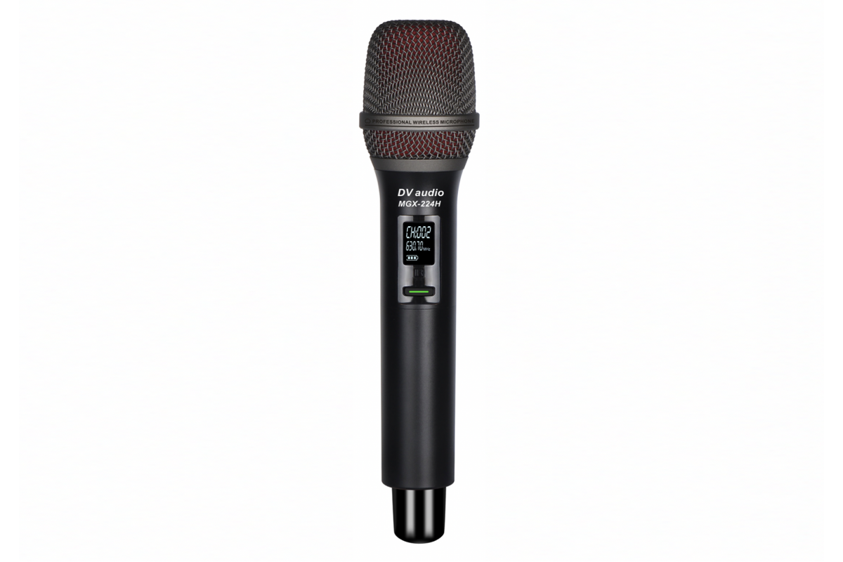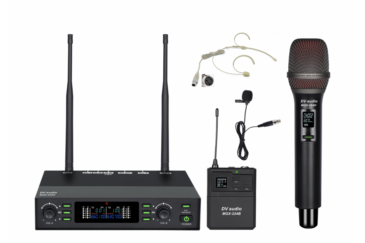 DV audio MGX-224HB - це надійна двоканальна UHF-радіосистема, розроблена для використання в караоке-закладах, конференц-залах, на невеликих сценах тощо.