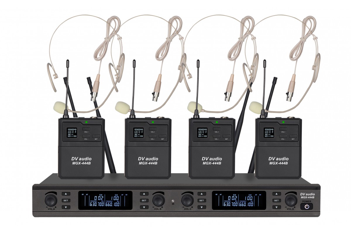 DV audio MGX-444B - це надійна двоканальна UHF-радіосистема, розроблена для використання в караоке-закладах, конференц-залах, на невеликих сценах тощо.